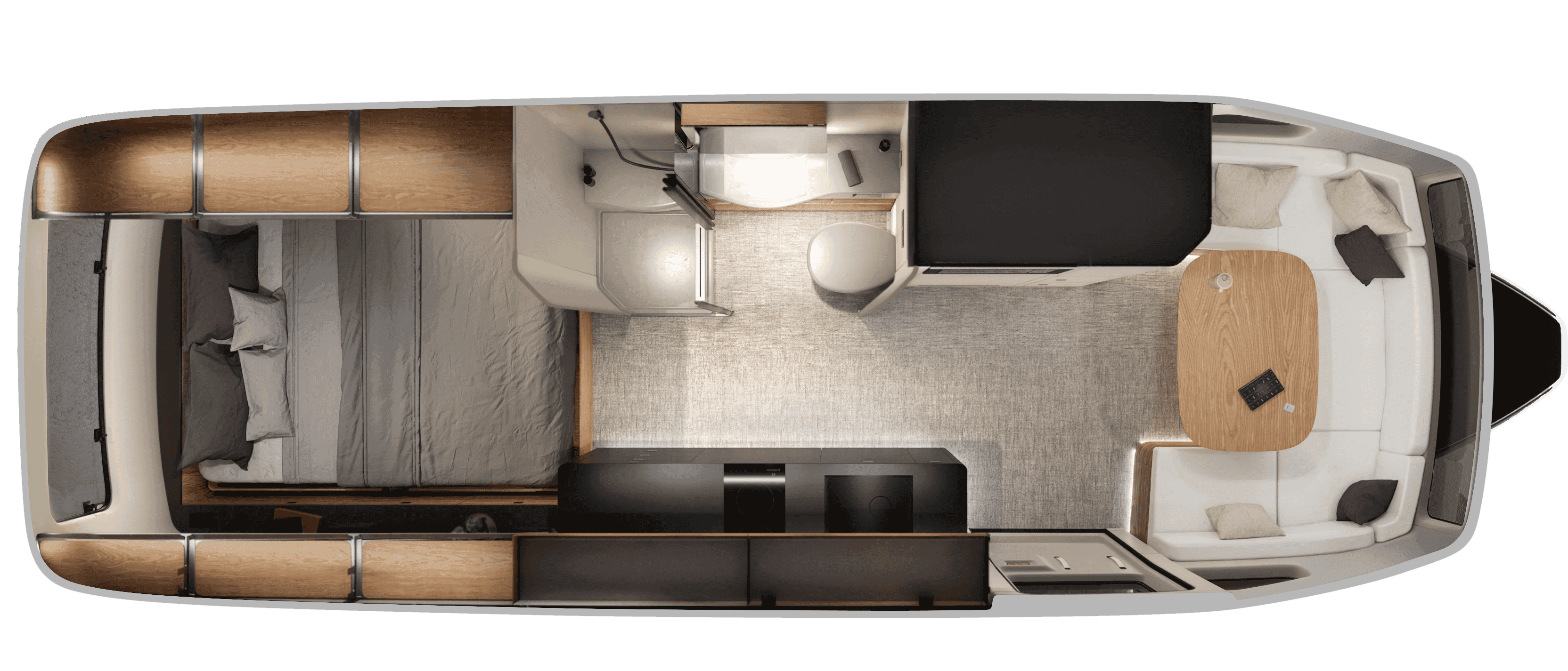 Panoramic windows give way to a 270° view. Convertible furniture, clever storage compartments, and minimalist, modern interior give you everything you need and the flexibility to make it your own.
