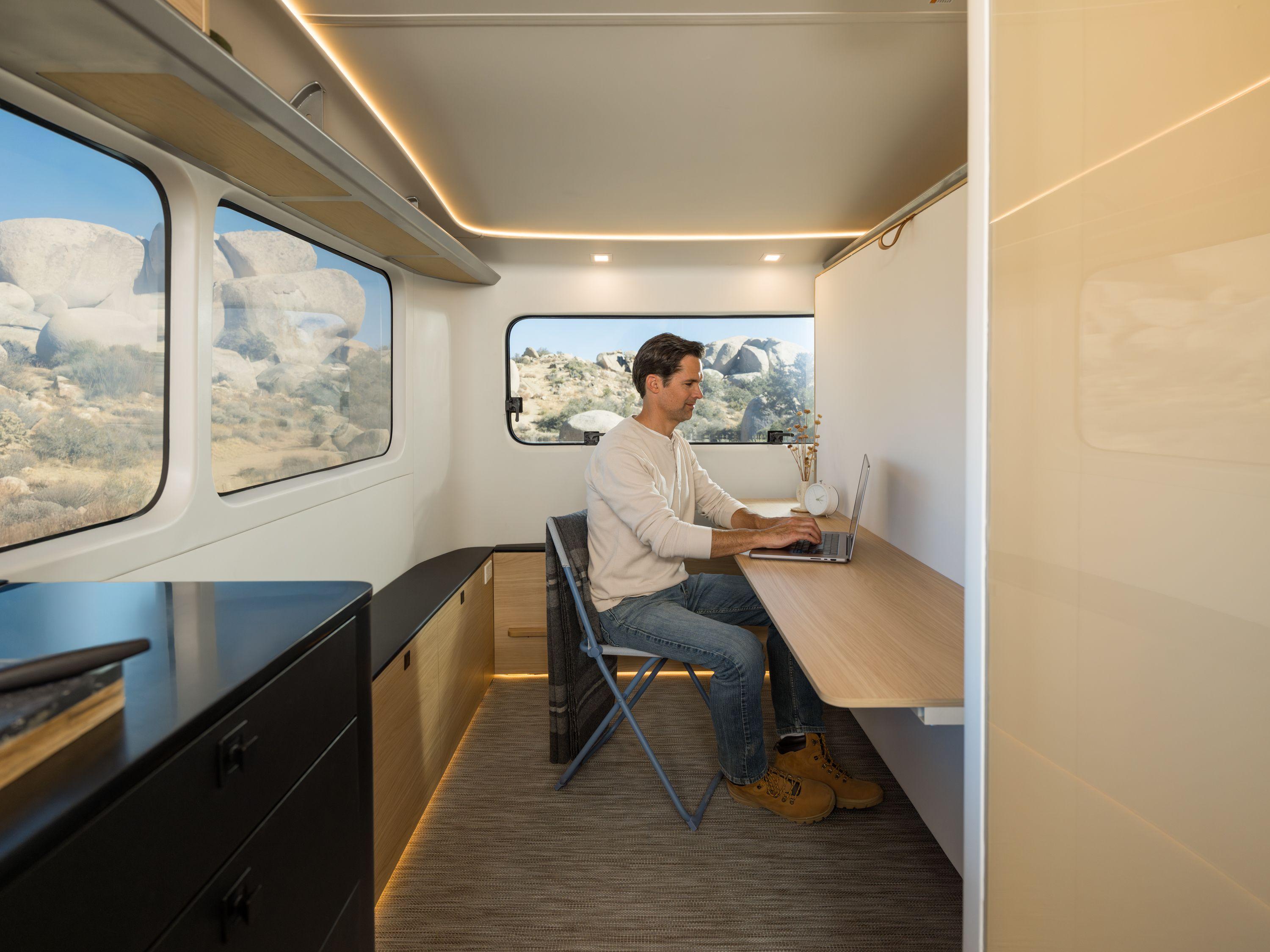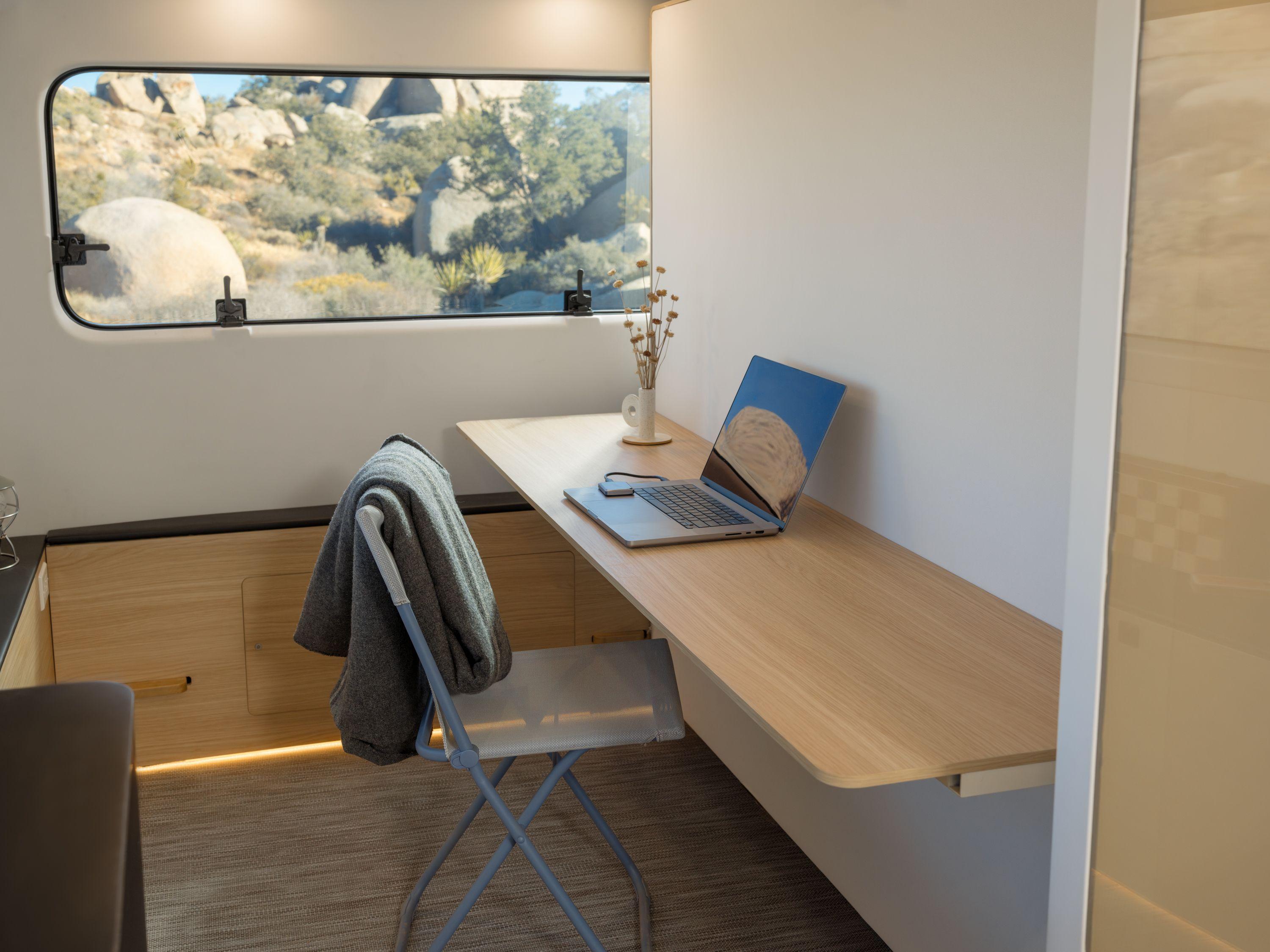 Lightweight, flexible furnishings help you move from leisure time to work time within seconds. The queen bed converts to a work-from-anywhere office with mobile internet, integrated power outlets, LED task lighting, and plug & play Starlink connectivity*. *separate subscription required
